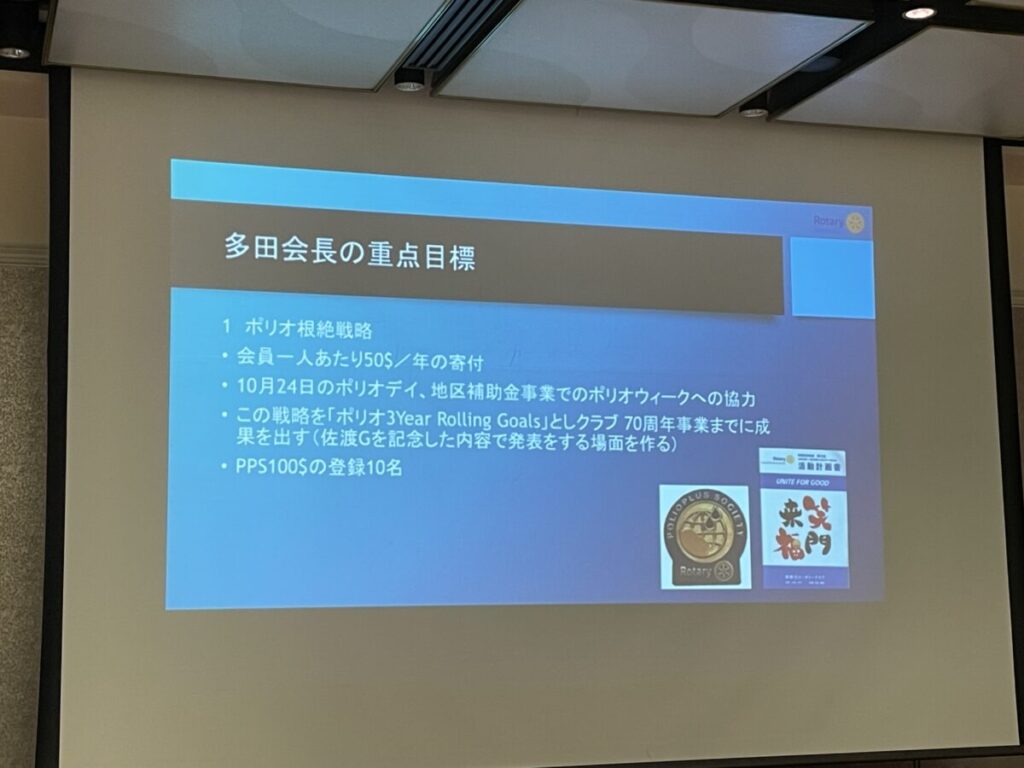 今年度、クラブ・地区ともに重点目標として掲げております「ポリオ根絶」について学ぶ例会となっております。
